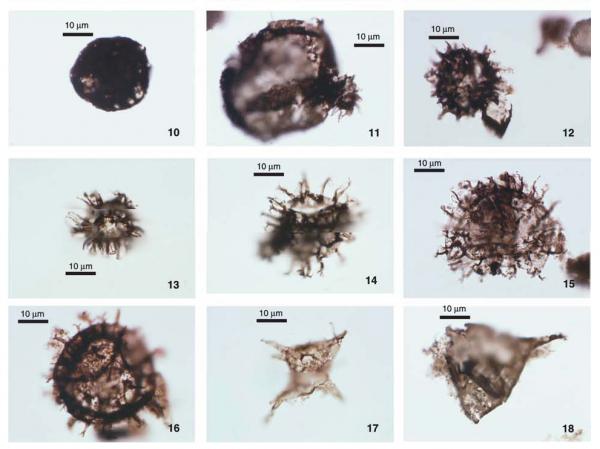 Ukázky střednoordovických acritarch z lokality Červený vrch. Převzato z článku Fatky (2003)